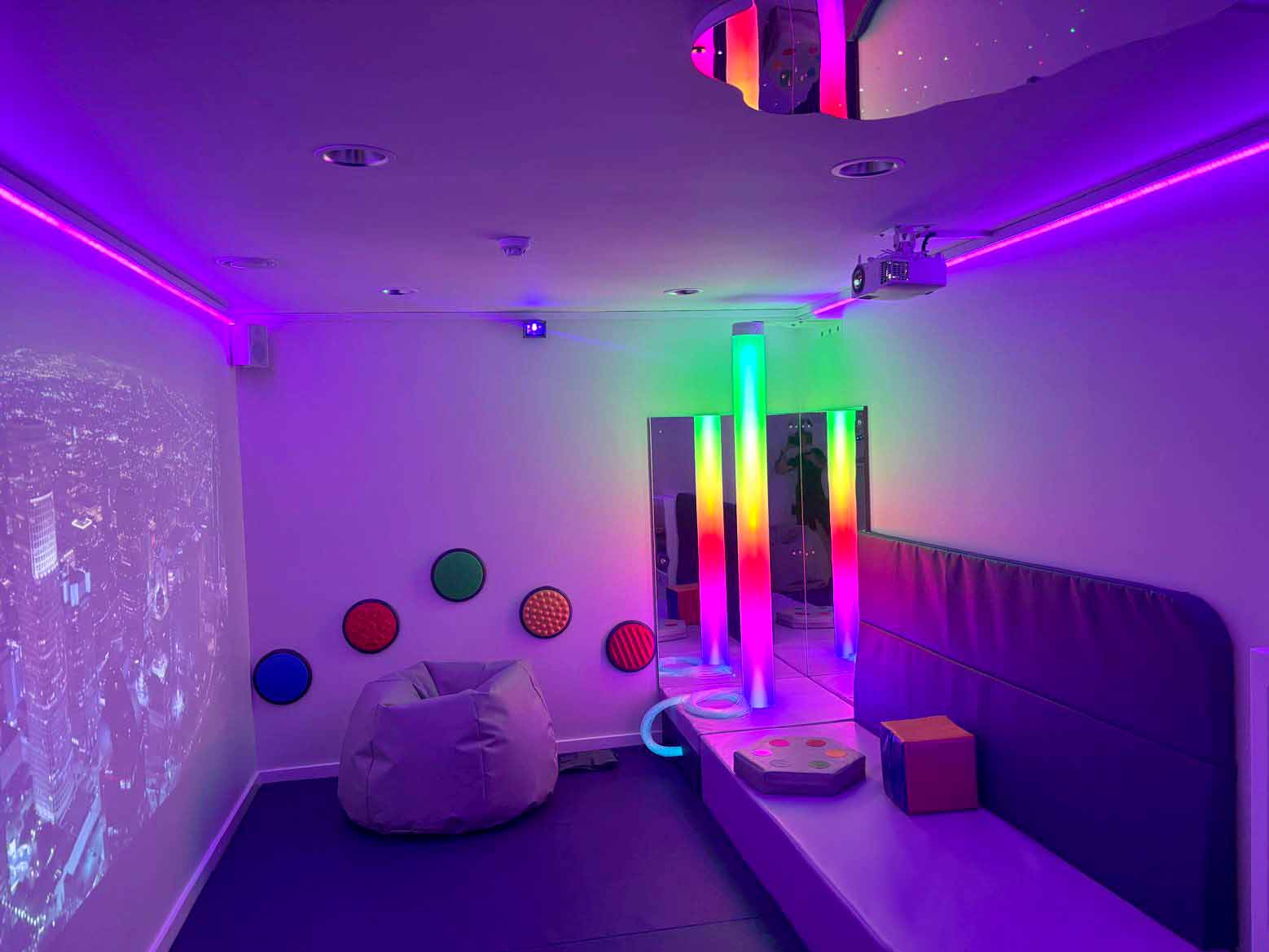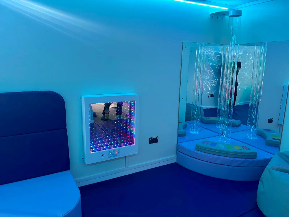 Additional features such as fibre optics, an infinity panel, tactile discs, and floor padding were added to create a comfortable and engaging environment, complete with a bench for structured seating.