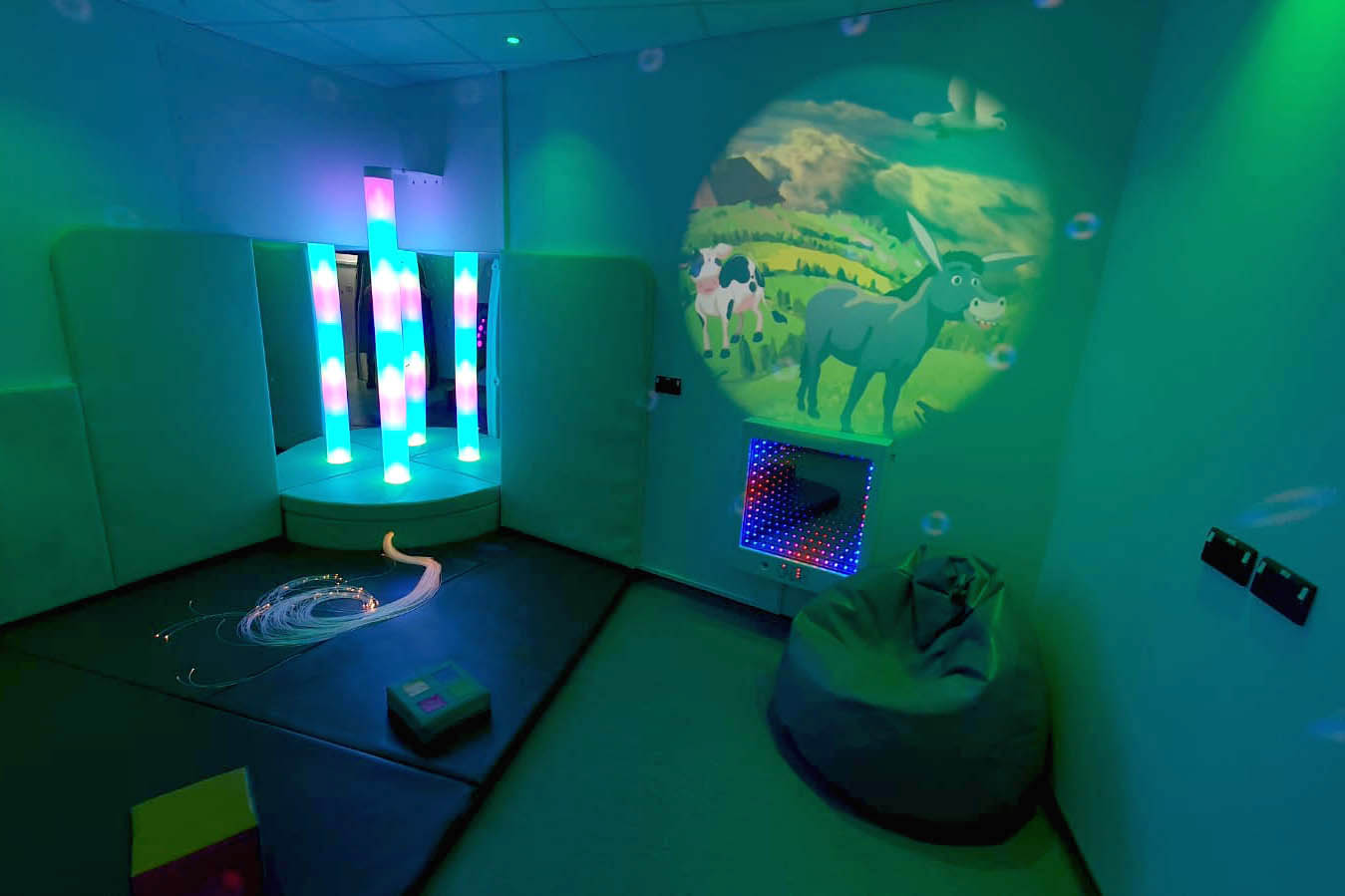 On the left side of the room, we installed a Quarter Circle Fibre Optic Curtain alongside an Interactive UV Tactile Panel, which fluoresces under UV light. On the right, we added an Infinity Panel offering 16 colour programmes and sound activation. Above it, a Solar LED 100 projector with interchangeable effects wheels projected moving visuals, helping to theme the space.